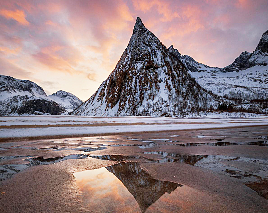 This image features the beach at Ersfjord, Norway, a stunning and well-loved spot on Senja Island. The view toward the ocean is flanked by mountains, creating a dramatic backdrop...read more