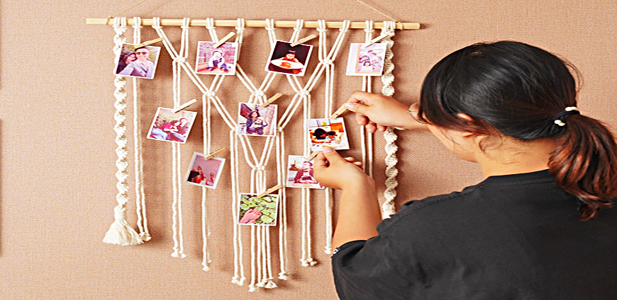 Am unusual variation of wall mounting for smaller images is a hand-woven macrame photo hanger that tastefully displays smaller-sized groups of photos. I's a work of art in itself and comes in different style and color options, complete with mounting clips.
