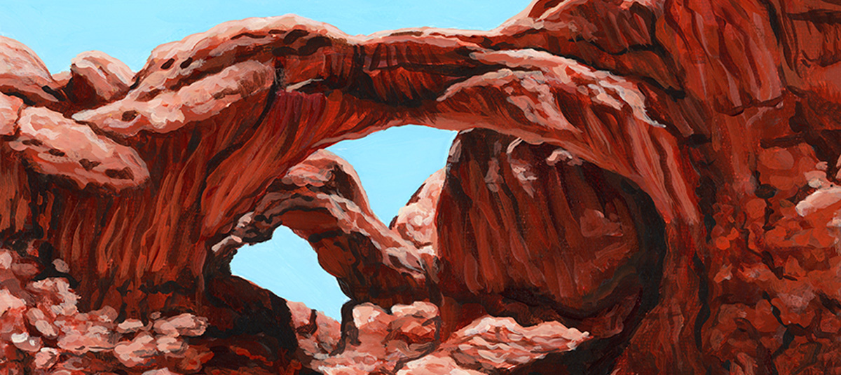 We can see Kristin's personal connection to America's parks through four striking paintings. Appearing above is Utah's Arches National Park, with its vibrant orange hues captured during a family cross-country road trip. Below, the collection flows from a breathtaking Acadia National Park sunset photographed during a 2023 trip with her husband, to the iconic avenue of oaks at South Carolina's Charles Towne Landing, and concludes with her beloved Devils Fork State Park in her home state, where Lake Jocassee's clear waters meet serene blue mountains.