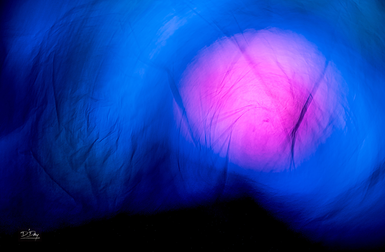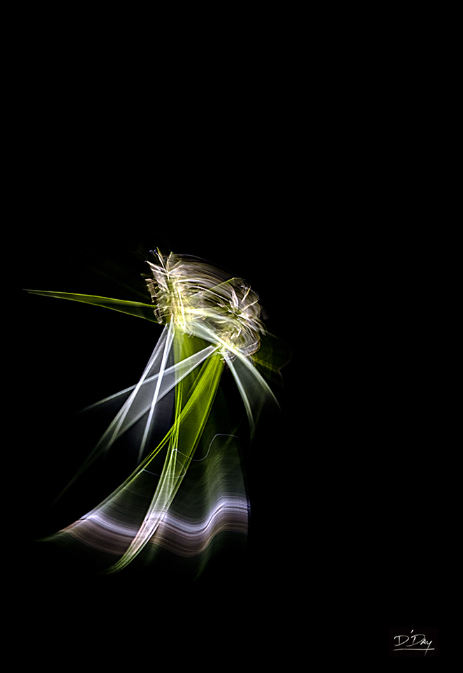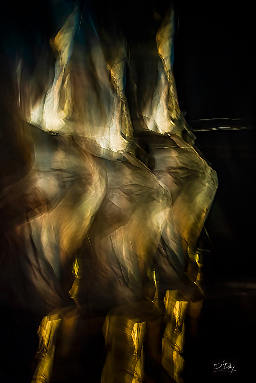 Using his camera as a paintbrush, David composes images by deliberately moving the camera — a gentle sweep, a quick jerk, a circular motion — during long exposures of one to five seconds. This technique transforms stationary subjects into fluid, dynamic images. For example, his “Hidden in Barbie Land†(below, top photo) is a combination of LED backlit tissue paper and plastic bags. He has also photographed weeds, sticks, cellophane, newsprint, and other unglamorous items.