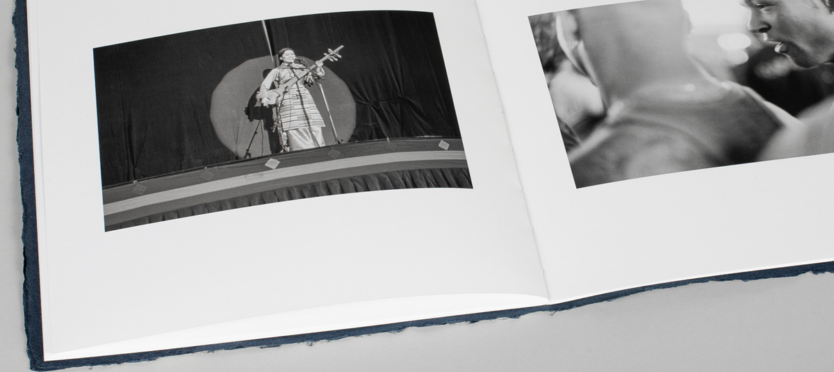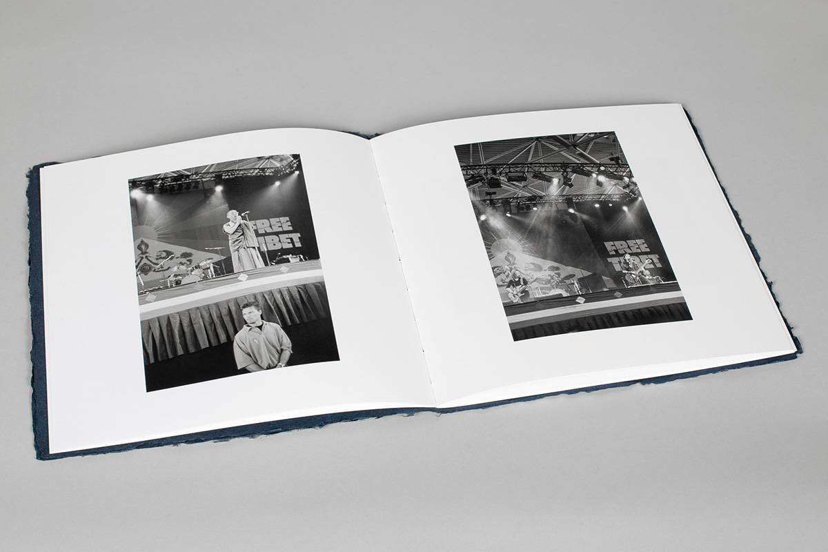 Take "Stronger Than the Waves Crashing on Us" (shown above and below), for example. Featuring photographs from the 1999 Tibetan Freedom Concert in Amsterdam, the book cover is crafted from cotton rag paper Frank made himself, giving him complete creative control. As for printing the photographs, he gets a little help from us.