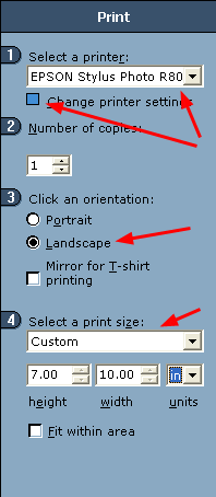A print dialog menu will appear. 1) Choose your printer 2) Make sure orientation is set to landscape 3) Select a print size of "Custom" 4) Set height and width to match your paper size 5) Important - CLICK ON CHANGE PRINTER SETTINGS When you click on printer settings, a dialog box will open which is the printer driver controls. Here you set media type, print quality, and most importantly - CUSTOM PAPER SIZES. You cannot print using Red River greeting cards without making a custom paper size in your printer driver. |