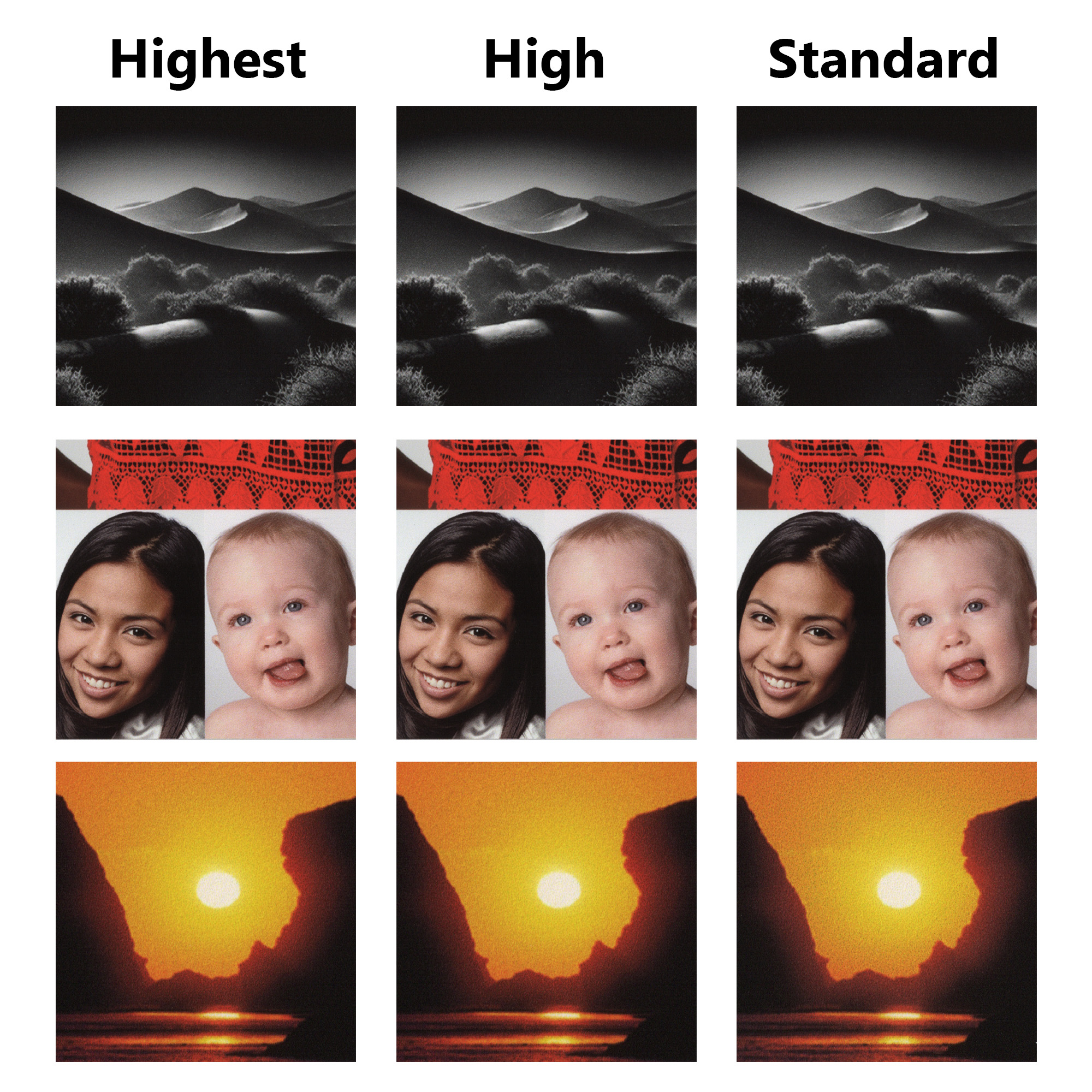 Differences between settings are visible, especially for color saturation, edge smoothness, and detail. We recommend High for most every-day projects due to its balance of quality and ink efficiency and Highest when you are producing giclee prints for galleries, museums, or high-end commercial sales.