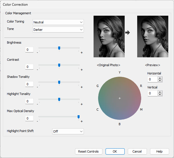In this situation, the driver will do black & white conversion. Controls include tonal presets (neutral, cool, warm, sepia), tonal sliders, and brightness and contrast sliders. Given the obscure tonality circle for custom tonal control, we use the tonal presets and, for the most part, leave it on the Black and White (neutral) setting. The downside of using the driver is the lack of soft proof or preview of the results before making a print.