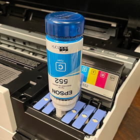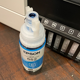 Epson EcoTank printers are "bottle fed" into large tank reservoirs. Unlike a cartridge printer whose cartridges hold 12-18 mL, ET series tanks hold 70 mL each.