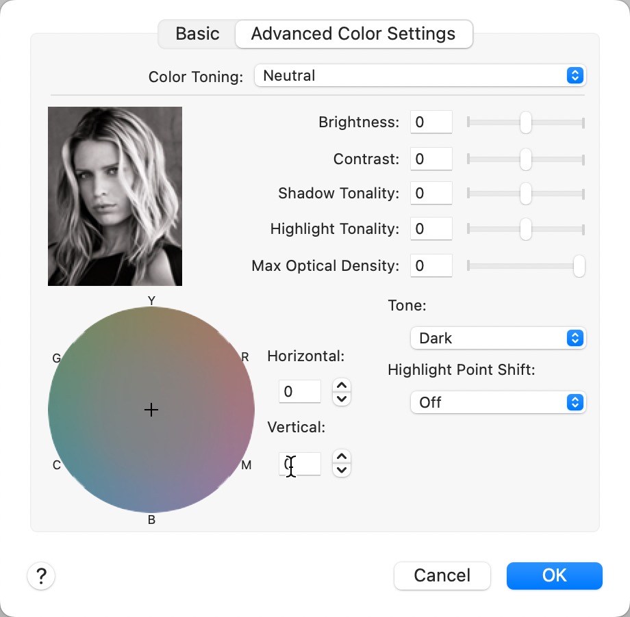 A number of variables are available including a color wheel for precise toning work. The only issue you'll find with these controls is the lack of a "live" preview of your image in the driver dialog. You are provided with a static image that shows the effect of different settings.
