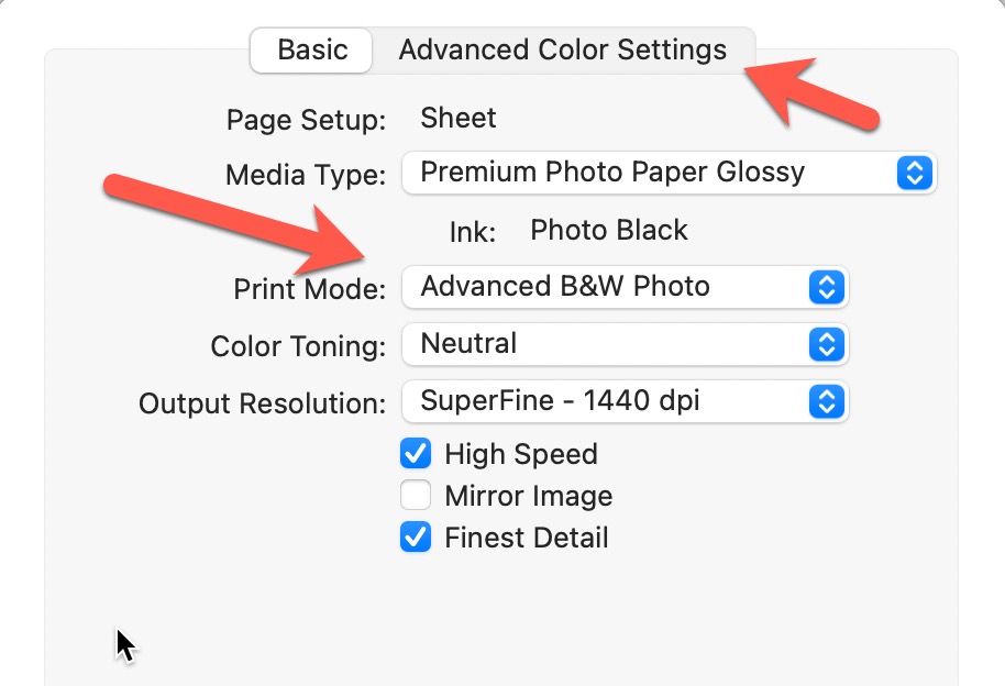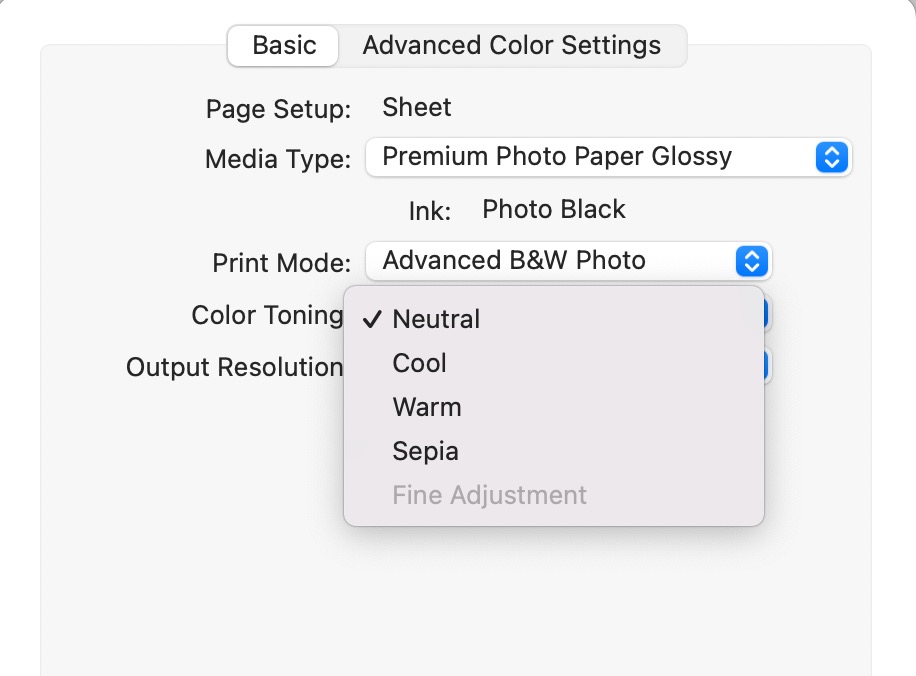 Access to the ABW mode starts in the Printer Settings menu under Print Mode. When ABW is chosen, you will see a drop-down labeled Color Toning. This is the quick method of using ABW for quick neutral or tone images.