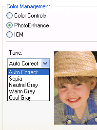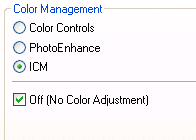 Epson's PhotoEnhance color management function offer more choices for printing if you do not use ICC profiles. Its best to experiment with these settings to see which work for your image type.
