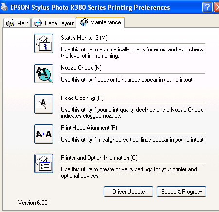 The preferences menu is standard Epson. Clicking the Print Option and Information button reveals the Envelope and Thick Paper setting. Use this if you experience any ink streaking or scuffs on especially thick paper.
