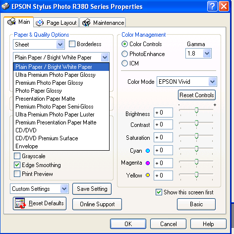 Media Selection - This screenshot, from the R380 driver, shows the selection of media types including the newely renamed Epson papers.