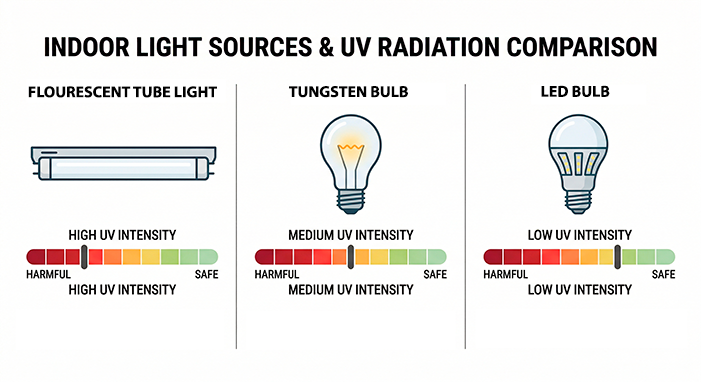 - Fluorescent lighting, which is nearly as damaging as sunlight when it comes to UV exposure