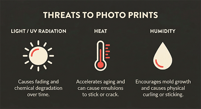 Every print will eventually fade. The only question is how quickly. Three factors drive deterioration more than any others: