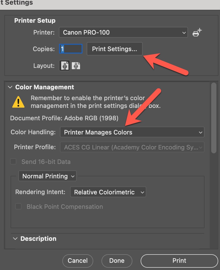 STOP - If this print looks good then we know that OS is blocking color management via printer profiles. At this point there is nothing to be done except wait for an update from Apple. Make prints using this method until the next major OS update when you can try using profiles from the photo software again.
