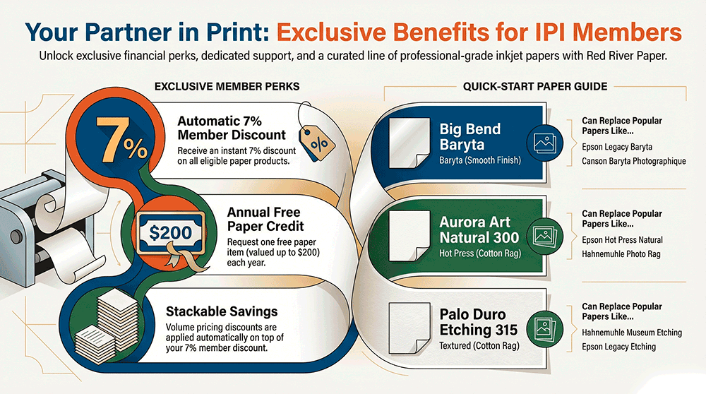At Red River Paper, we believe that your paper supplier should be more than just a vendor - they should be a partner in your success. For almost 30 years, we've delivered professional-grade photo and art inkjet paper that matches or exceeds the quality of the brands print shops already rely on. What sets us apart is our combination of consistent in-stock inventory, fast shipping, and hands-on customer support from real people who know printing. Whether you're running a busy lab or a specialty photo business, we offer fair, transparent pricing with volume discounts, a carefully curated lineup of top-performing media, and a level of service that's increasingly rare in this industry. Call or email us anytime - we'll answer. That's how we've earned the trust of thousands of professionals, and that's the standard we bring to our new partnership with the IPI community.