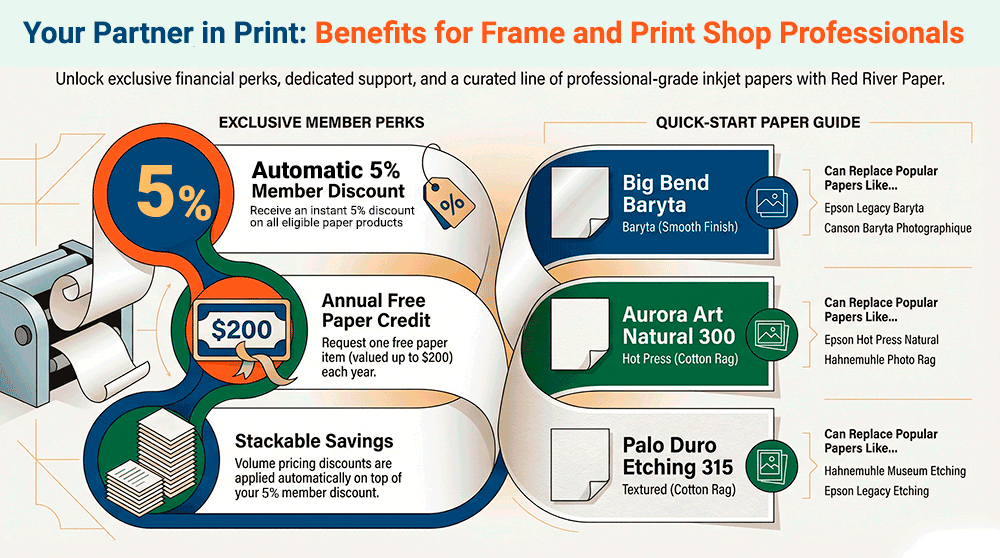 At Red River Paper, we believe that your paper supplier should be more than just a vendor - they should be a partner in your success. For almost 30 years, we've delivered professional-grade photo and art inkjet paper that matches or exceeds the quality of brands framing shops already rely on. What sets us apart is our combination of consistent stock inventory, fast shipping, and hands-on customer support from real people who know printing. We offer fair, transparent pricing with volume discounts, a carefully curated lineup of top-performing media, and a level of service that's increasingly rare in this industry. Call or email us anytime - we'll answer. That's how we've earned the trust of thousands of professionals, and that's the standard we bring to our partnership with the framing community.